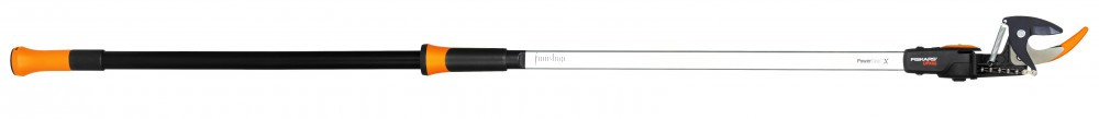 Mellévágó kivitelű, ideális a maximum 3,2 cm átmérőjű friss ágak vágásához. A maximális elérhető vágási magasság: 3,8 m, a vágási szög 230 fokban állítható. A narancssárga részek jobb láthatóságot biztosítanak, tartós SoftGrip anyagú markolata kényelmes é
