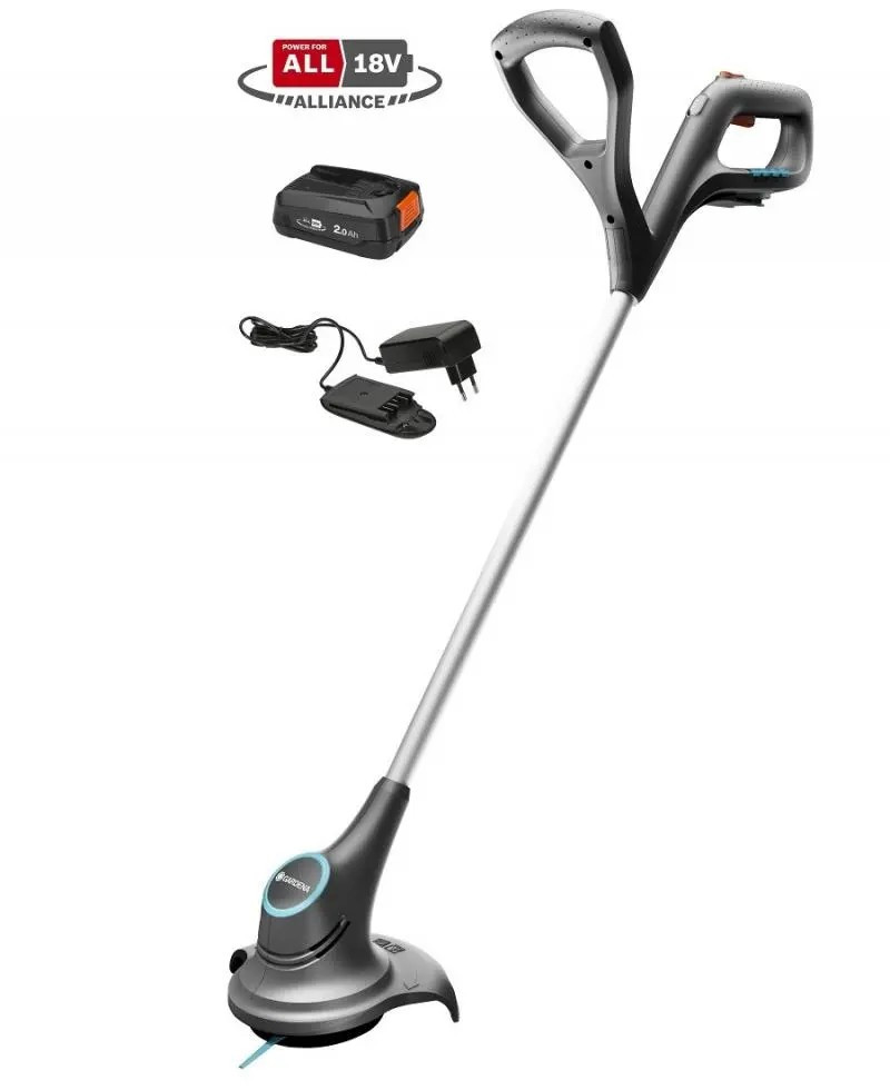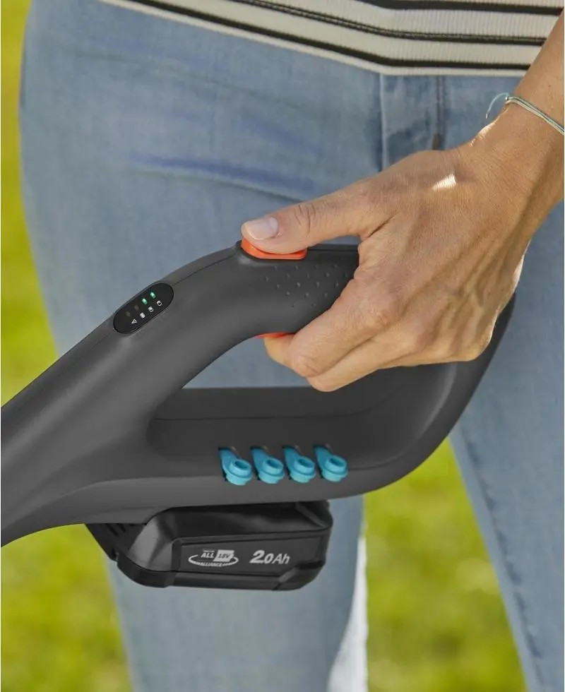 A GARDENA extra könnyű SmallCut 23/18V P4A akkumulátoros fűszegélynyíró használatra kész készletével könnyedén nyírhatod a gyepszegélyeket az akkumulátorral együtt mindössze 2,0 kg-os, alacsony súlyának köszönhetően. A nagyméretű markolat és a kiegészítő elülső markolat jól megtervezett ergonómiájával nyűgöz le. Ez teszi lehetővé, hogy kényelmes testtartást vehess fel a szegély nyírásakor. A 23 cm munkaszélességű RotorCut műanyag késekkel precíz, hatékony és tiszta vágásokat végezhetsz. A SmallCut különösen alkalmas a gyep sarkainak vagy olyan szűk területek vágására, amelyeket a fűnyíró nem ér el. Az ergonomikus nyélbe épített LED-kijelző mutatja az akkumulátor aktuális töltöttségét. Teljesen feltöltve a készletben megtalálható 2,0 Ah-s akkumulátor körülbelül 40 percig üzemel. Ezenkívül négy pótkés tárolható a markolatban. A GARDENA SmallCut 23/18V P4A akkumulátoros fűszegélynyíró használatra kész készlet töltővel és gyorsan feltölthető 18 V-os POWER FOR ALL akkumulátorral kerül forgalomba. Az akkumulátor több mint 70 ALLIANCE márkájú szerszámmal kompatibilis. A POWER FOR ALL ALLIANCE a vezető akkumulátorgyártók egyik legnagyobb márkafüggetlen szövetsége, amelynek akkumulátorai számos kerti és háztartási eszközben használhatók. Így pénzt takaríthatsz meg, miközben rugalmas maradsz! Egy egyszerű online regisztrációt követően a GARDENA három év gyártói szavatosságot vállal az akkumulátoros fűszegélynyíróra. Szenvedély a GARDENA-val EGYETLEN akkumulátorrendszer a kertben végzett összes feladathoz. Akkumulátor feszültsége 18 V Akkumulátor teljesítmény 2.0 Ah Üzemidő 40 min Jellemző töltési idő 80% 96 p Jellemző töltési idő 100% 124 p Akkumulátor típusa Lítium-ion Mellékelt akkumulátorok száma 1 Vágási szélesség 23 cm Szálmeghosszabbítási mód RotorCut kések Növényterelő Nem Súly akkumulátorral 2.0 kg Garantált zajnyomás, LWA 86 dB(A) Zajszint 77 dB(A) Rezgés (ah) Vibration max ah 3.2 m/s2