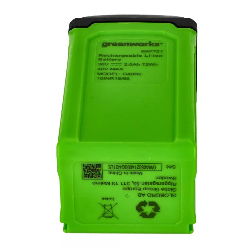 A Greenworks 40V-os, G40B2 akkumulátora kompakt csomag: minden Greenworks 40V kerti géppel kompatibilis, biztosítja a szükséges energiát és a hosszan tartó teljesítményt, hogy Ön gyorsan elvégezhesse a különféle munkálatokat.Líthium-ionos technológiaHossz:17,5 cmSzélesség:9 cmMagasság:8,4 cmWatt óra:72 WhSúly:0,84 kg100%-os Töltési idő (2Ah):80 perc100%-os töltési idő (4Ah):30 percCsomag méret (Szélesség x Magasság x Mélység):105x180x95 mmTípusok: Greenworks: G40B2,