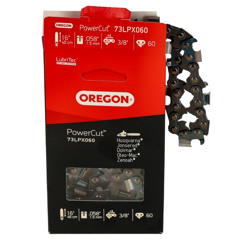 Oregon gyártmányú 60 szemes konfekcionált fűrészlánc.Ideális lánc a 3/8” osztású láncfűrészekkel dolgozó professzionális favágóknak. Csúcsteljesítmény az alacsony rezgésnek és az egyenes élű vágószemnek köszönhetően. Az eltolt mélységhatárolók megakadályozzák, hogy a vágószemek a vágásfalba marjanak és így sima vágást biztosítanak.Tulajdonságok:- A LubriTec™ a lánc és a vezetőlemez olajozásával biztosítja a kisebb súrlódást és a hosszabb élettartamot- A kékített vágószemek magas szintű korrózióvédelmet biztosítanak- A tetőlapon lévő jelzések megkönnyítik a pontosabb élezést- Az exkluzív OCS-01 acél fokozottabb tartósságot biztosítOsztás:3/8-1,5 mmSzem szám:60 szem