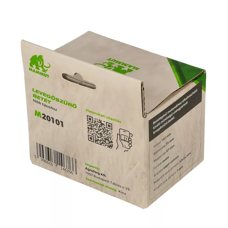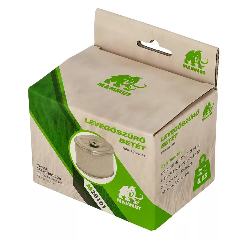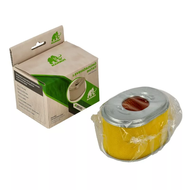 A feladata, hogy kiszűrje a belső égésű motornak beszívott levegőből a port, szennyeződéseket és egyéb mikrorészecskéket, ezzel védve a hengert és a belső mozgó alkatrészeket a korai kopástól és károsodástól.Honda GX140/160/200 motorhoz levegőszűrő betét, előszűrővel együtt.Gyári cikkszám:17210-ZE1-82117210-ZE1-82217210-ZE1-50517210-ZE1-820Helyettesítő O-30-404-O, O-30-404/1, O-30-404/3, O-30-404Hossz:102 mmSzélesség:73 mmMagasság:70,4 mmForma:oválisAnyaga:papír+szivacsNagyobb lyuk átmérő:32x34 mmKisebb lyuk átmérő:7 mmCsomagméret (Szélesség x Magasság x Mélység):104 x 105 x 77 mmTípusok: MAMMUT: Honda GX-140, Honda: